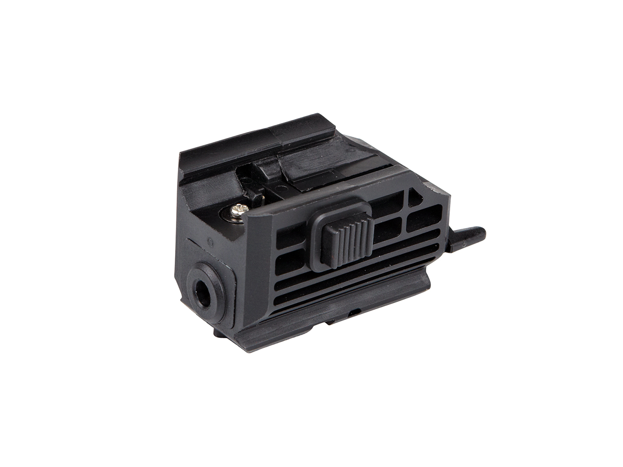 Compact rail mounted laser for all Airsoft guns. Will fit on all standard rails including any AEG with a weaver/picatinny system. The compact design will fit on pistols like the CZ75 series and STI Duty one. Rugged lightweight construction, slides on easily, and stays tightly locked on with the aid of a retention spring. The laser is fully adjustable for windage and elevation and features an ambidextrous on/off switch that can be activated by either the shooting or non-shooting hand.