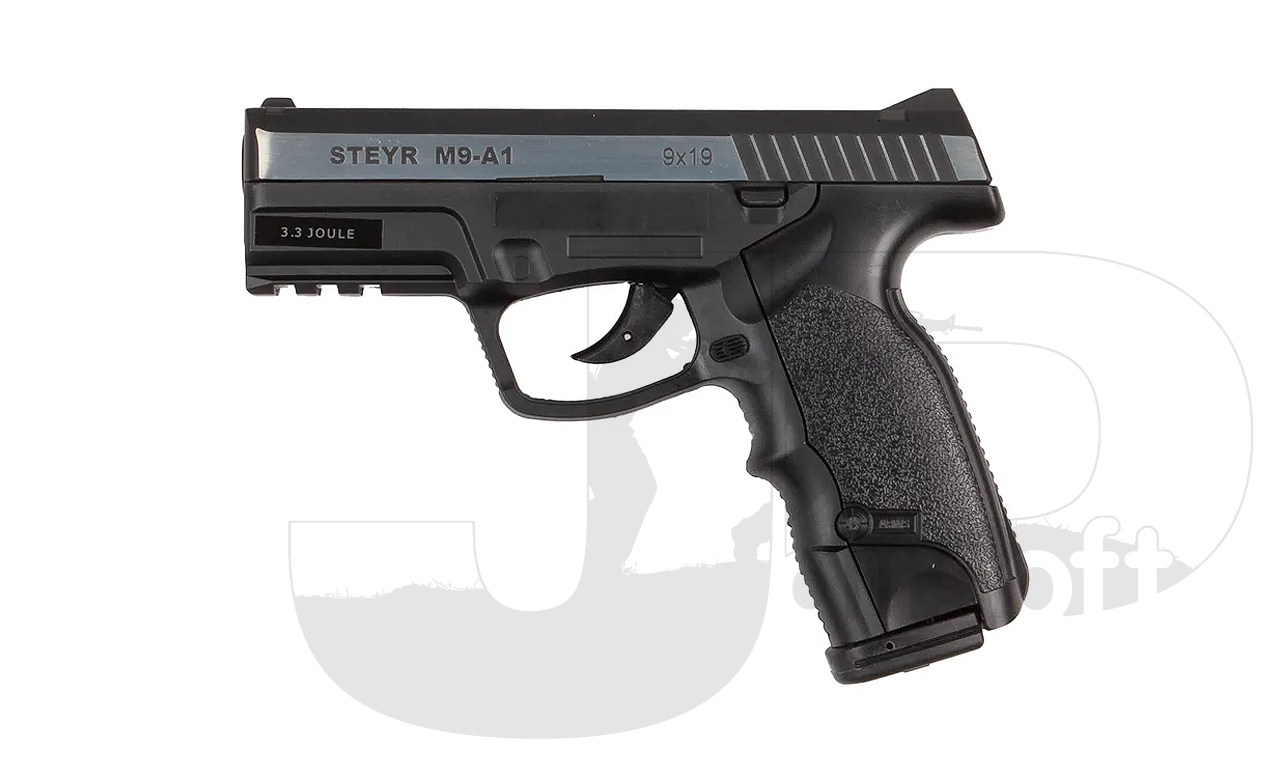 A semi automatic airgun version of the latest Steyr Mannlicher pistol – the M9-A1. Elegant dual-tone finish with authentic markings. One of the hardest shooting airguns. The ergonomic grip has been designed in a 111 degree angle to improve ergonomics. Rear fiber optic sight and waiver accessory rail makes this pistol very comfortable and with the opportunity to mount laser and flashlight. The 19 BB’s are stored in the drop-out magazine and the 12g CO2 cartridge is placed in the easyload grip and is easily changed.