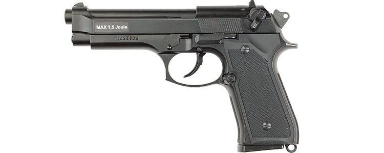 A version of the classic M9 models with metal slide – very realistic in feeling and handling. Gas operated semi-automatic blowback with adjustable hop-up and a double stacked magazine that holds 25 BB’s – note that a Co2 magazine is available for this model.
